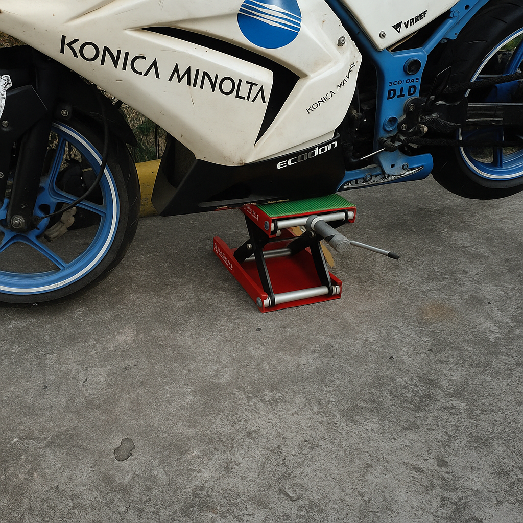 Built from high-tensile steel, it ensures superior strength and durability under heavy loads. The scissor-type mechanism provides smooth height adjustment for easy access to the underbody, wheels, and suspension components. Its wide base ensures excellent stability, while the rubber-padded top platform protects the bike’s chassis from scratches and slipping